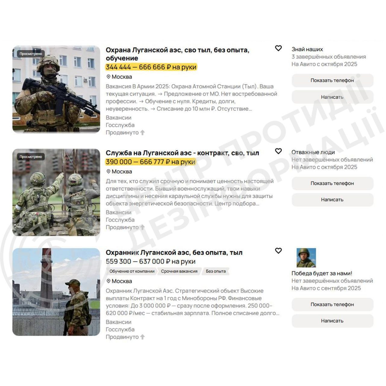 У російських онлайн-сервісах із працевлаштування поширюються оголошення про набір “охоронців” на “Луганську АЕС”, якої в реальності не існує. У Центрі протидії дезінформації називають це способом вербування росіян на війну проти України.