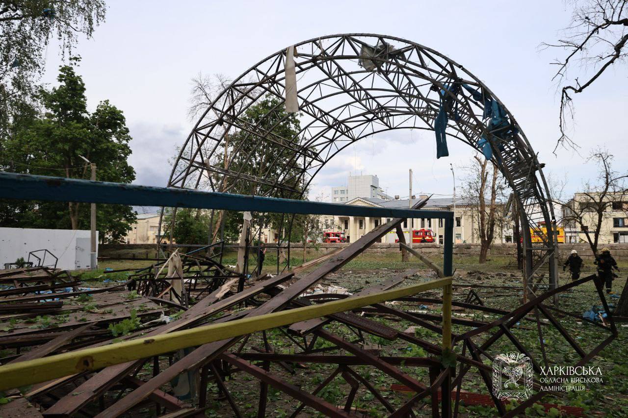 “Близько 17.35 ворог завдав ударів 4 керованими авіабомбами по Шевченківському та Київському районах міста. Одне з влучань — по Дитячій залізниці. Це місце, де зазвичай багато родин із дітьми. росіяни б’ють саме туди в суботу вдень. Внаслідок обстрілу пошкоджено 2 будівлі Дитячої залізниці та 4 вагони, 2 приватні будинки, господарчу споруду”, – написав Синєгубов.