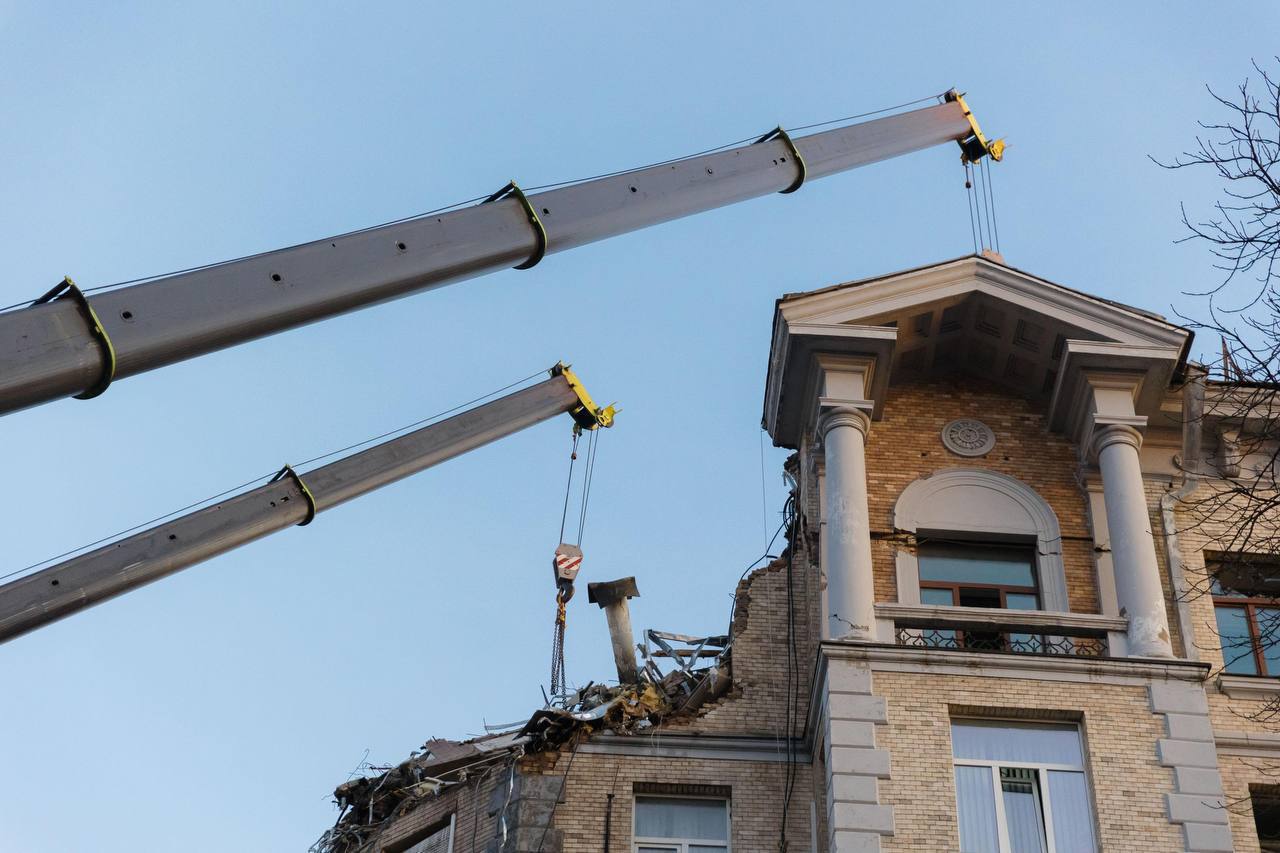 У МВС повідомили, що аварійно-рятувальні роботи на місці удару ворожим дроном вранці 1 січня тривають у складних умовах, до них залучили спеціальну техніку, на місці робіт перебувало керівництво Міністерства внутрішніх справ.