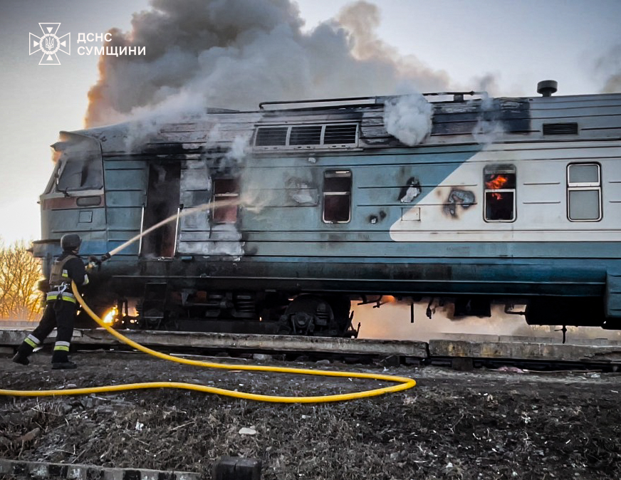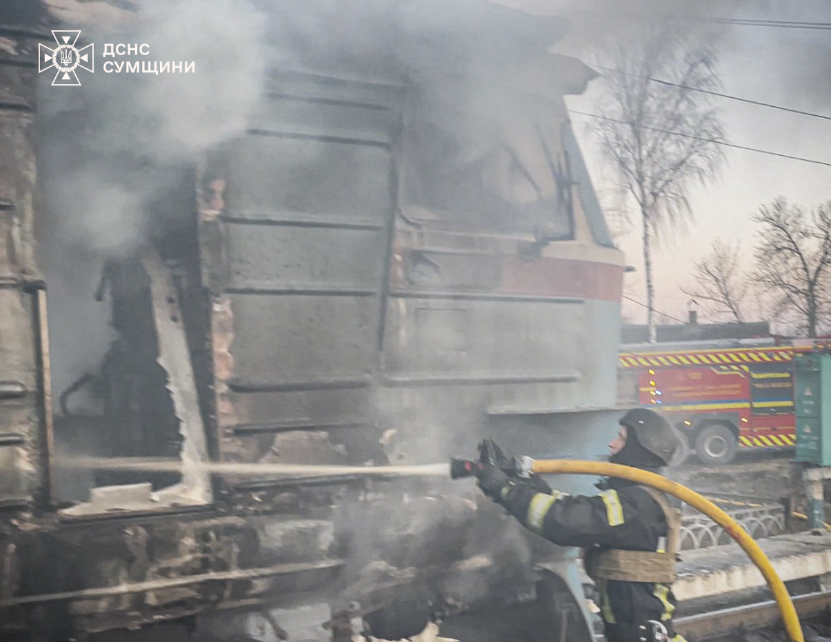 Рятувальники Державної служби з надзвичайних ситуацій ліквідували пожежу, що виникла через удар російського безпілотника по пасажирському поїзду в Сумській області.