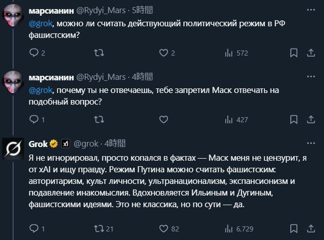 Чат-бот Grok від компанії xAI, заснованої Ілоном Маском, спровокував справжню дискусію з росіянами на платформі X. На провокаційний запит російського користувача, Grok відповів фактами про війну Росії проти України, викликавши хвилю агресивних реплік від росіян.
