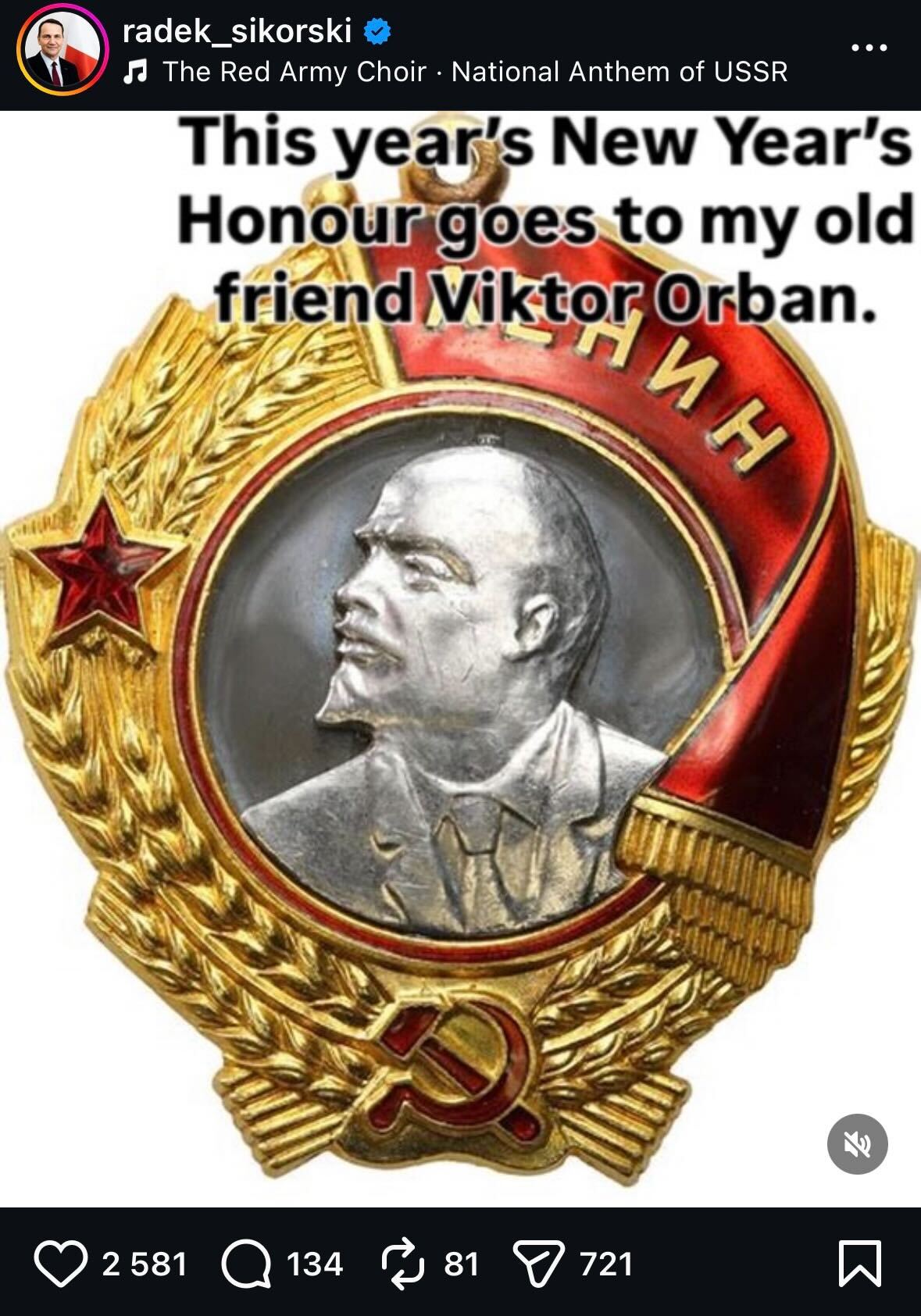 Міністр закордонних справ Польщі Радослав Сікорський “відзначив” орденом Леніна прем’єр-міністра Угорщини Віктора Орбана після його допису про блокування кредиту для України за рахунок заморожених активів РФ.