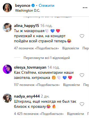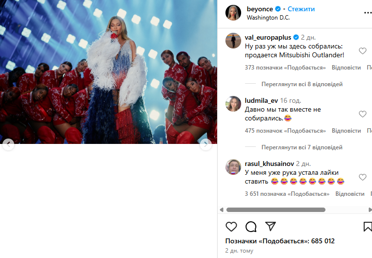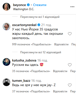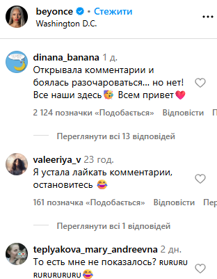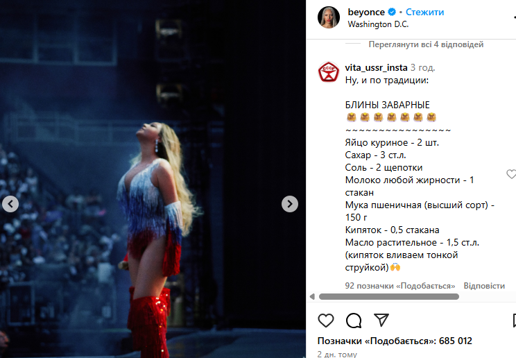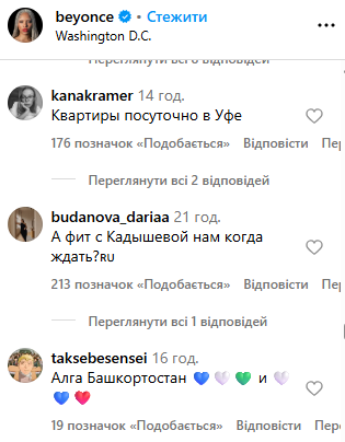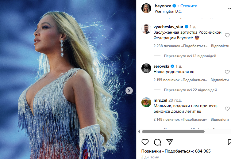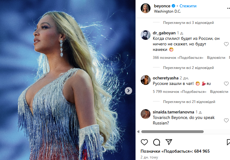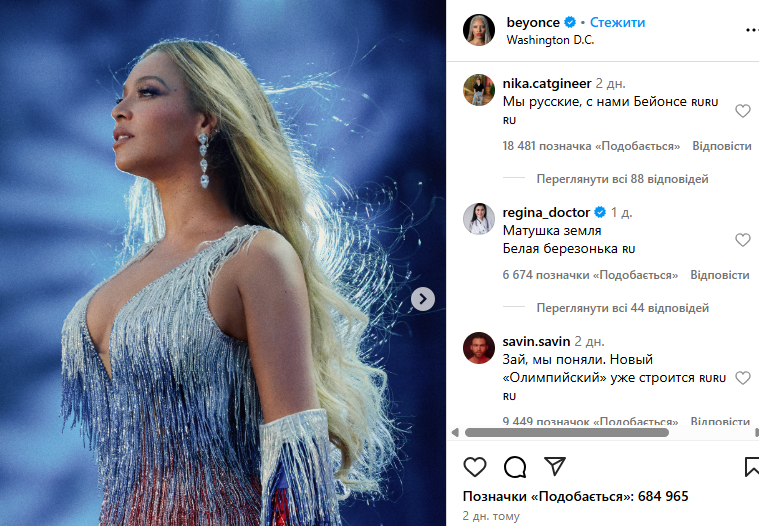 Світлинами з виступу Бейонсе поділилася у своєму Instagram. Цього виявилося достатньо, аби росіяни заполонили коментарі, закидуючи лайками саму співачку та один одного. Російські користувачі соцмережі побачили “приховану підтримку” Росії, почали називати співачку “своєю” та закликали приїхати з концертом. Інші почали нагадувати рецепти млинців та цитували російські фільми.