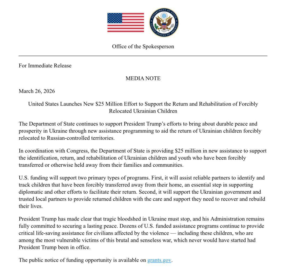 Державний департамент США офіційно оголосив про запуск нової гуманітарної ініціативи, спрямованої на підтримку дітей, примусово вивезених на підконтрольні Росії території. Загальний обсяг фінансування становить 25 мільйонів доларів, які будуть розподілені між програмами з ідентифікації, безпечного повернення та подальшої соціальної адаптації української молоді.