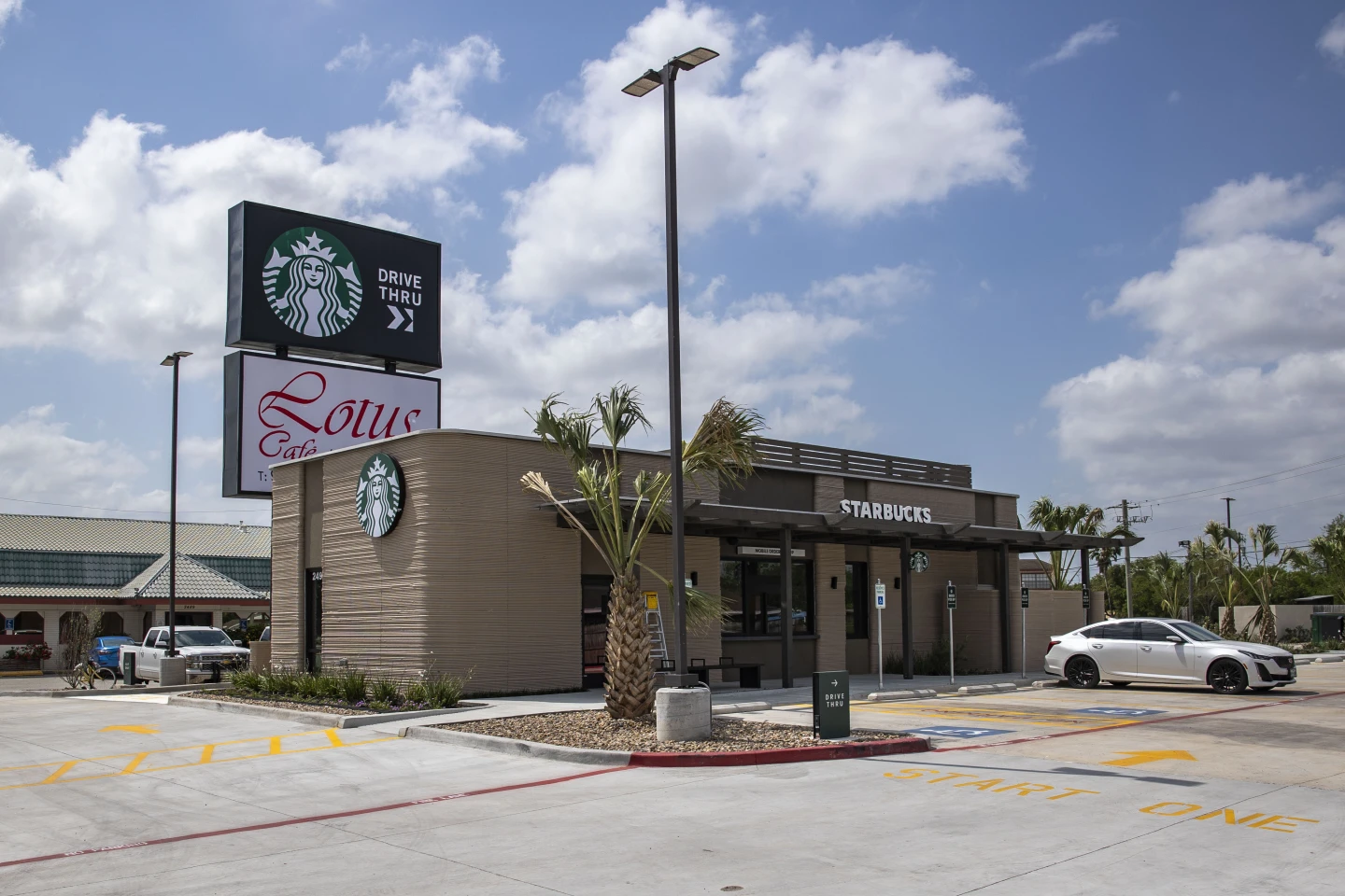 Кавовий гігант Starbucks, який має понад 17 000 закладів у США, відкриває унікальний заклад у Браунсвіллі, Техас, надрукований на 3D-принтері. Для будівництва використовували роботизовану руку, яка наносила шари бетону.