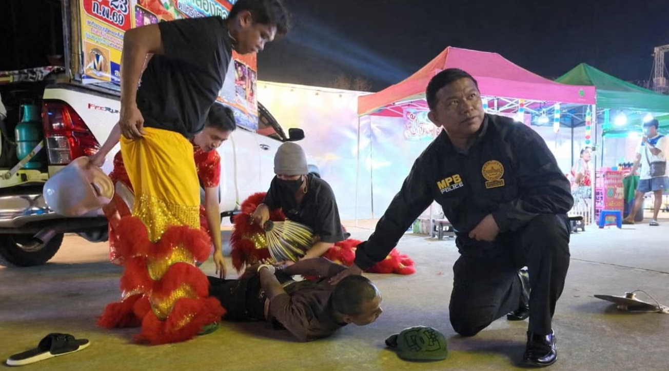 На відео, опублікованому поліційним управлінням Бангкоку видно, як офіцери у костюмі левів танцюють у бік підозрюваного, коли він гуляв ярмарком Місячного Нового року у храмі в Нонтхабурі, провінції поблизу Бангкоку.