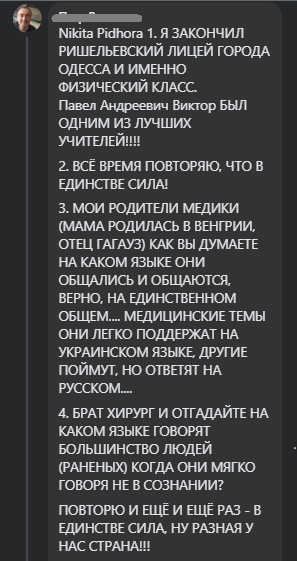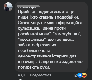 “Прийшов подивитися, хто це пише і хто ставить вподобайки. Слава Богу, не моя інформаційна бульбашка. “Війна проти російської мови”, “самогубство”, “неосталінізм”, що там іще?… – забагато брехливих перебільшень та демонстративної істерики для іноземців. Лавров і ко задовлено потирають руки”, – вказано в одному з коментарів.