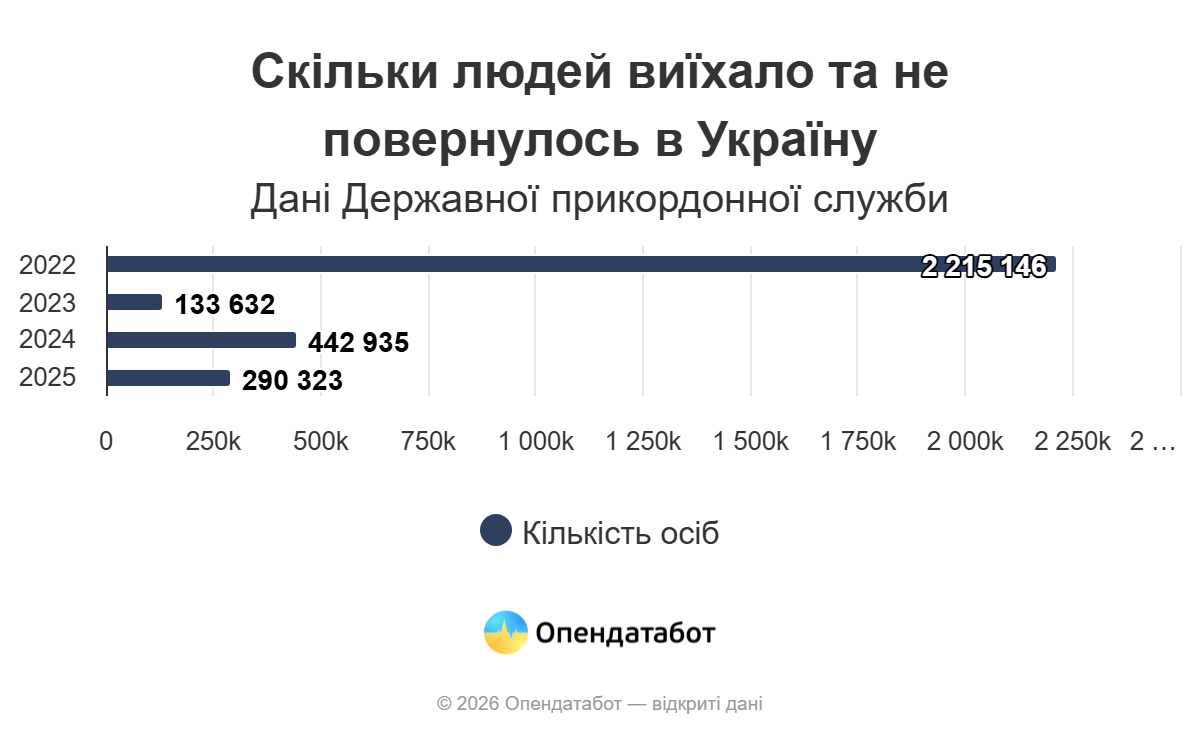 Протягом 2025 року 290,3 тисячі українців виїхали за кордон і так і не повернулись. Однак, це в 1,5 раза менше, ніж у 2024 році.