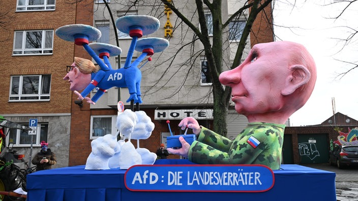 На платформах Путін керує дроном з написом “AfD”, з’являється разом із Трампом, пожираючи Європу, а також пронизує мечем маленького карнавального блазня у символічному протесті проти переслідування Тіллі.