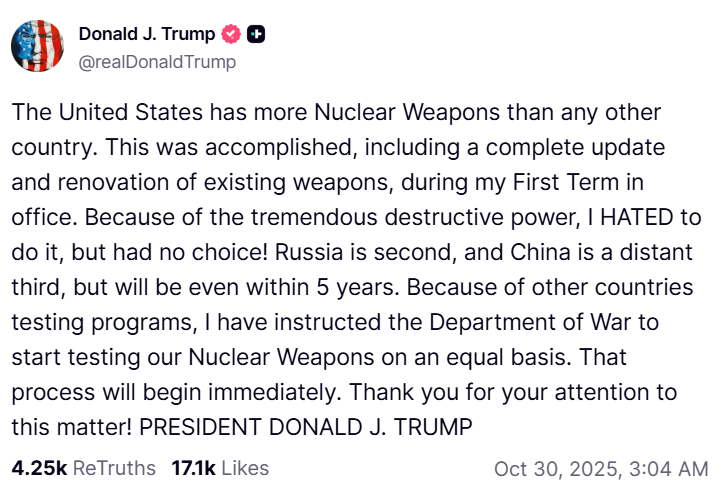 “Сполучені Штати мають більше ядерної зброї, ніж будь-яка інша країна. Це було досягнуто, включаючи повне оновлення та модернізацію існуючої зброї, під час мого першого терміну на посаді. Через її величезну руйнівну силу я ненавидів це робити, але не мав вибору! Росія посідає друге місце, а Китай – віддалене третє, але вже за 5 років він вийде на перше місце. З огляду на програми випробувань інших країн, я доручив Міністерству оборони розпочати випробування нашої ядерної зброї на рівних умовах. Цей процес розпочнеться негайно”, – написав президент США.