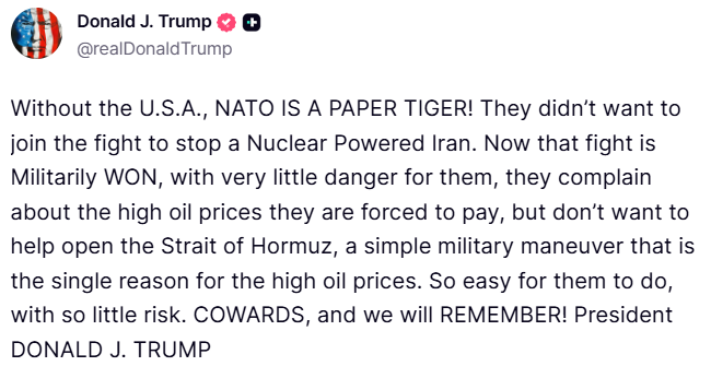 “Тепер, коли ця боротьба виграна у військовому плані, причому для них це не несло майже ніякої небезпеки, вони скаржаться на високі ціни на нафту, які змушені платити, але не хочуть допомагати у відкритті Ормузької протоки — це простий військовий маневр, який і є єдиною причиною високих цін на нафту. Для них це так легко, з таким незначним ризиком. Боягузи, і ми це запам’ятаємо!” – написав президент США.