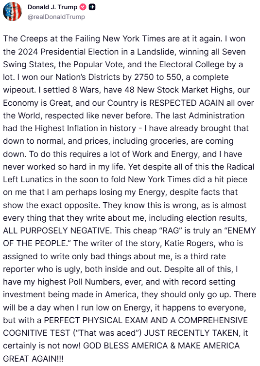 “Покидьки з провальної газети New York Times знову взялися за своє. Я здобув переконливу перемогу на президентських виборах 2024 року, вигравши у всіх семи штатах, що вагалися, за кількістю голосів виборців і в колегії виборників. Я виграв у округах нашої країни з рахунком 2750 до 550, що є повним розгромом. Я завершив 8 воєн, маю 48 нових рекордів на фондовому ринку, наша економіка чудова, і наша країна знову поважається у всьому світі, як ніколи раніше. Остання адміністрація мала найвищу інфляцію в історії — я вже знизив її до нормального рівня, і ціни, включаючи продукти харчування, знижуються. Для цього потрібно багато роботи та енергії, і я ніколи в житті не працював так важко. Однак, попри все це, радикальні ліві божевільні з The New York Times, яка скоро зникне, написали про мене статтю, в якій стверджують, що я, можливо, втрачаю енергію, попри факти, які свідчать про протилежне. Вони знають, що це неправда, як і майже все, що вони пишуть про мене, включаючи результати виборів, все навмисне негативне”, – написав президент США.