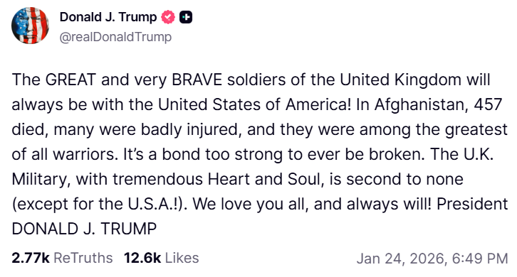 “Великі та дуже хоробрі солдати Сполученого Королівства завжди будуть разом зі Сполученими Штатами Америки! В Афганістані загинуло 457 осіб, багато хто отримав важкі поранення, і вони були одними з найкращих воїнів. Це надто міцний зв’язок, щоб його можна було розірвати. Британські військові, з їхнім величезним серцем і душею, не мають собі рівних (крім США!). Ми любимо вас усіх і завжди будемо любити!” – написав Трамп.