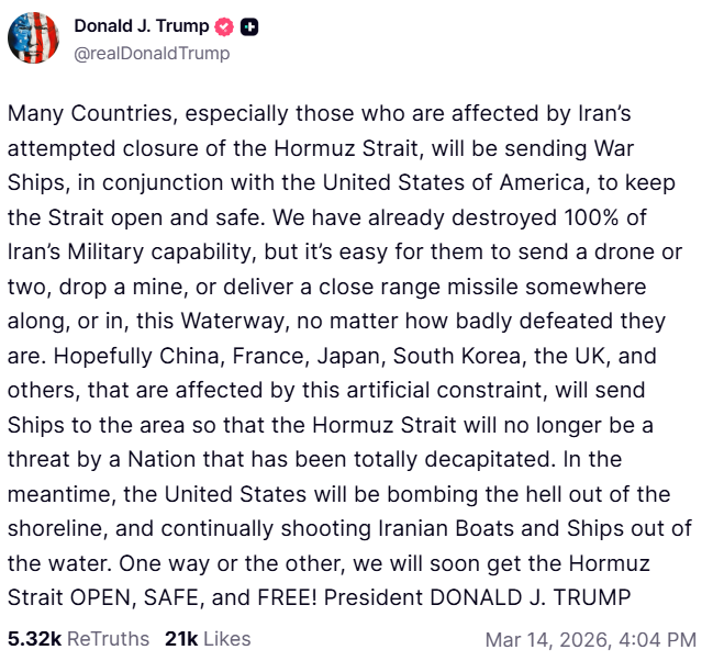 “Сподіваємося, що Китай, Франція, Японія, Південна Корея, Велика Британія та інші країни, які постраждали від цього штучного обмеження, відправлять кораблі в цей район, щоб Ормузька протока більше не становила загрози з боку держави, яка була повністю обезголовлена. Тим часом Сполучені Штати будуть бомбардувати берегову лінію, не шкодуючи боєприпасів, і постійно збивати іранські човни та кораблі. Так чи інакше, ми незабаром зробимо Ормузьку протоку відкритою, безпечною та вільною!” – написав Трамп.
