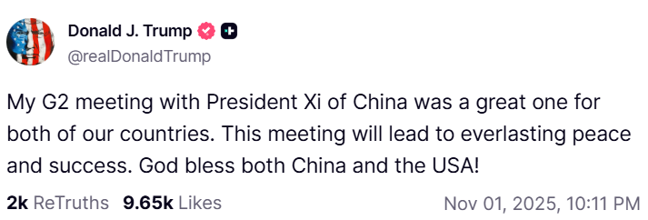 Президент США Дональд Трамп заявив, що його недавня зустріч із лідером Китаю Сі Цзіньпінем приведе до “вічного миру та успіху”.