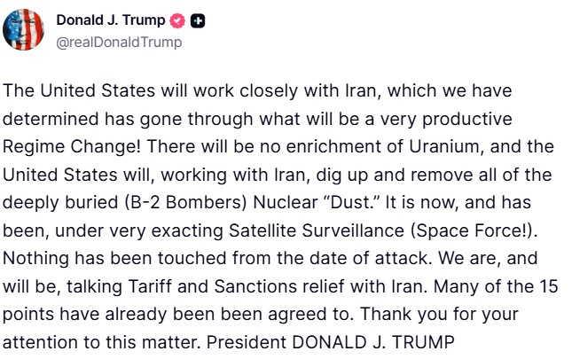 “Зараз, як і раніше, над цією територією здійснюється дуже ретельне супутникове спостереження (Космічні сили!). З моменту нападу нічого не було порушено. Ми ведемо і будемо вести переговори з Іраном щодо скасування мит і санкцій. Багато з 15 пунктів вже узгоджено”, – зазначив президент США.