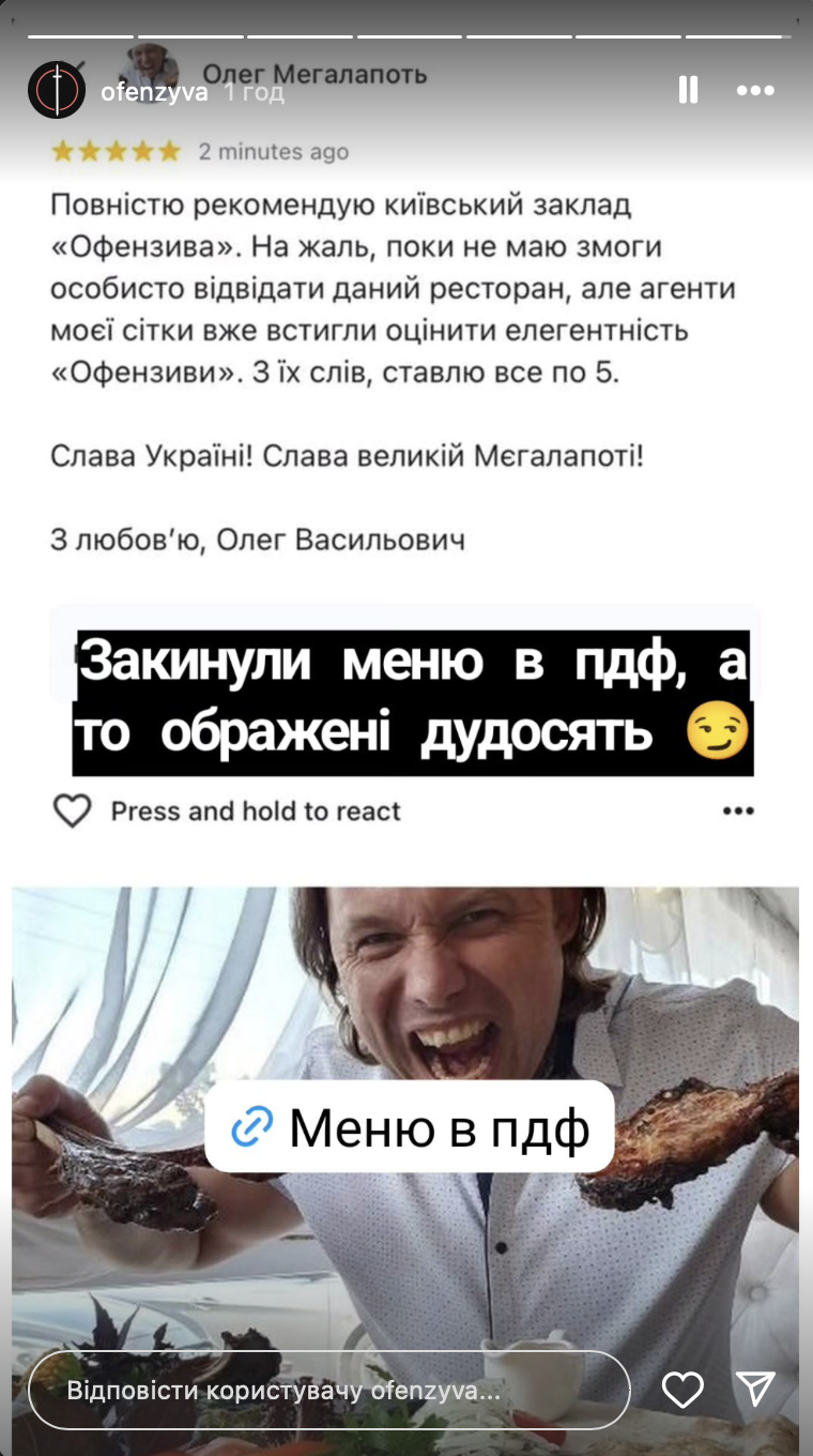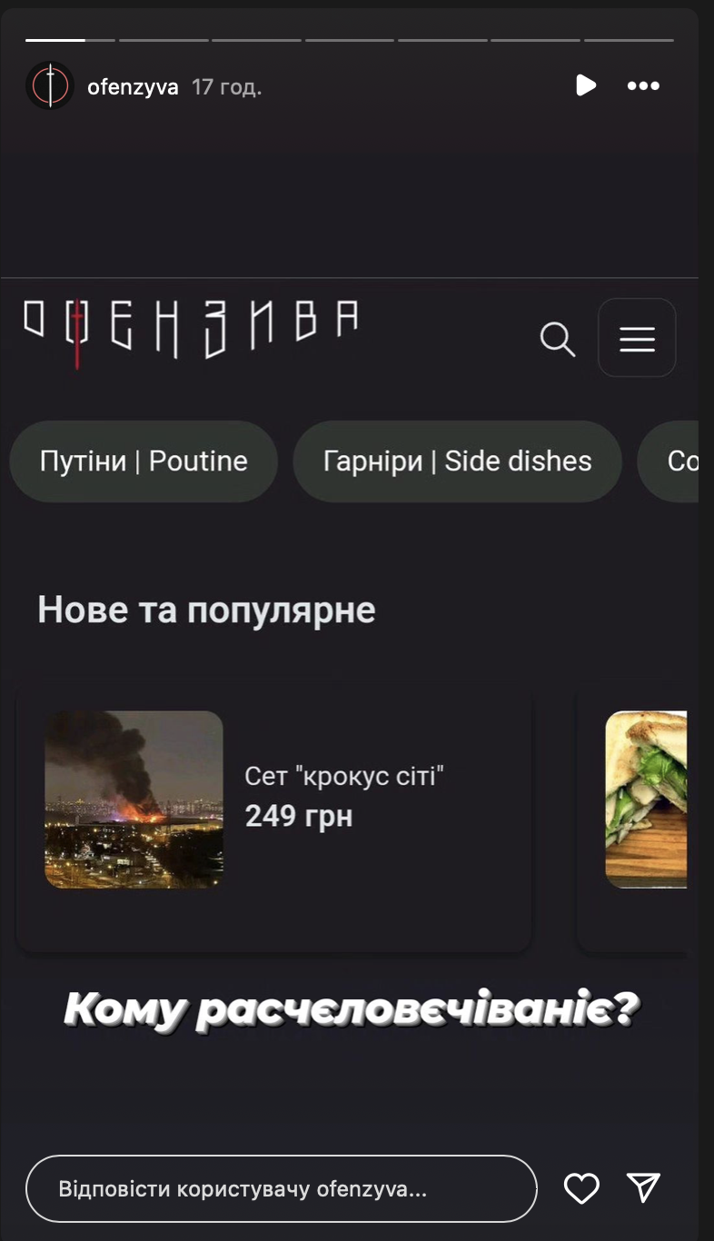 У київському барі “Офензива” в меню пропонують страви з такими назвами як сендвіч “Навального”, сет “Крокус” та інші, проте росіяни так обурились оригінальними назвами, що знизили рейтинг закладу, задудосили меню, погрожують та пишуть негативні коментарі.