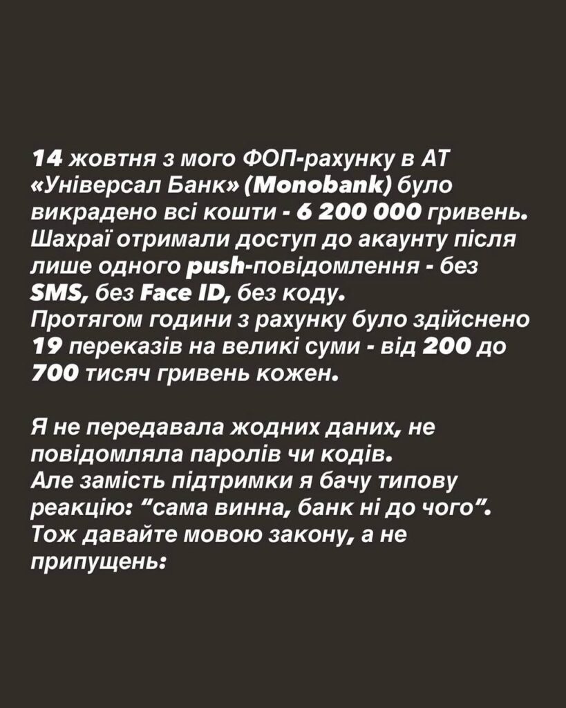 У блогерки Манекен вкрали понад 6 млн грн з рахунку ФОП: у Monobank відреагували