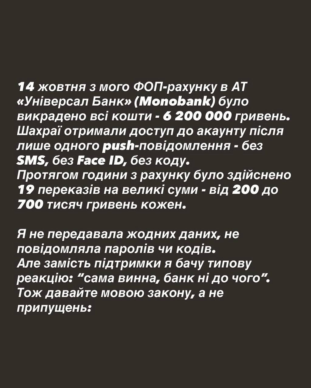 Співзасновник Monobank Олег Гороховський пояснив, що блогерка самостійно надала шахраям доступ до свого акаунту, виконавши їхні інструкції. За його словами, система безпеки не виявила операції як підозрілі, оскільки перекази відповідали типовій активності ФОП рахунків.