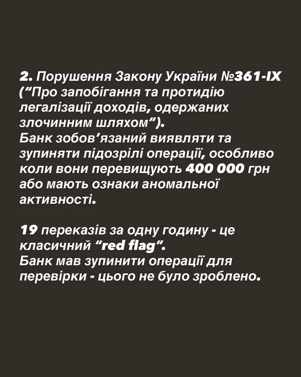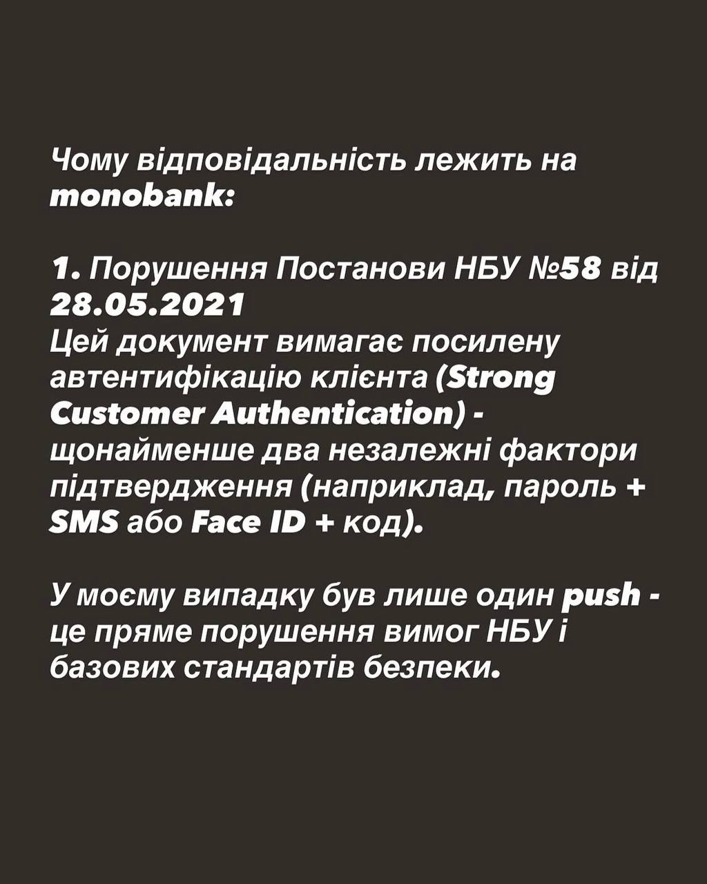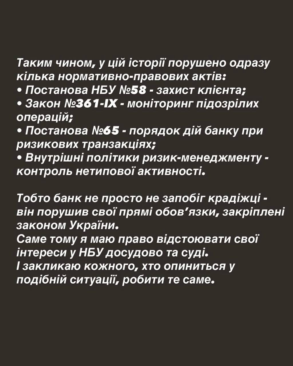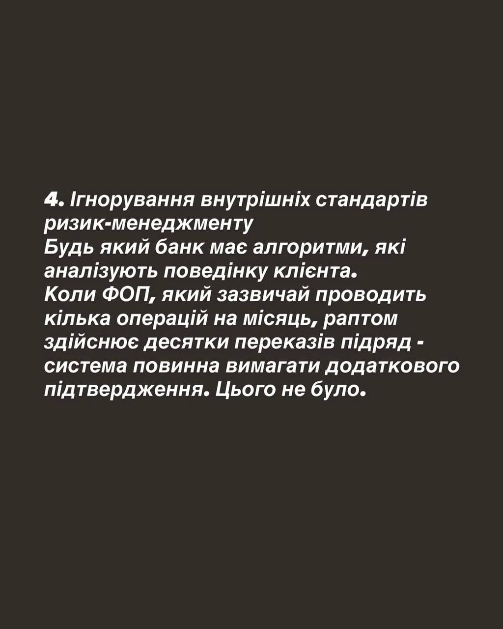 “Наша система аналізу не порахувала ті платежі, які зробив ФОП підозрілими, оскільки це досить типова бізнес-активність для підприємців, які ведуть активний бізнес. Оскільки застосунок був видалений клієнт не отримувала повідомлення про списання коштів з рахунку”, – написав він.