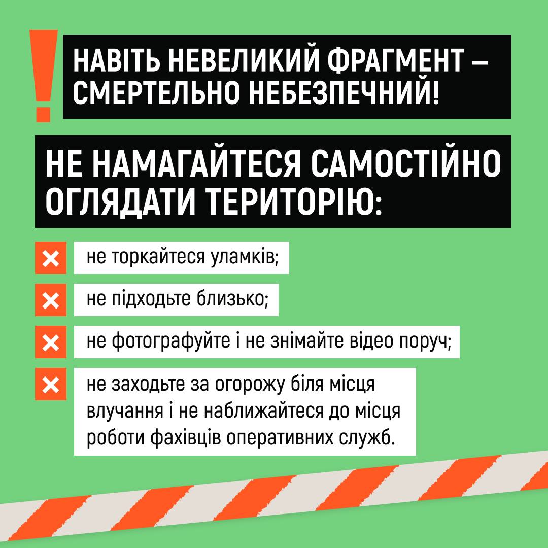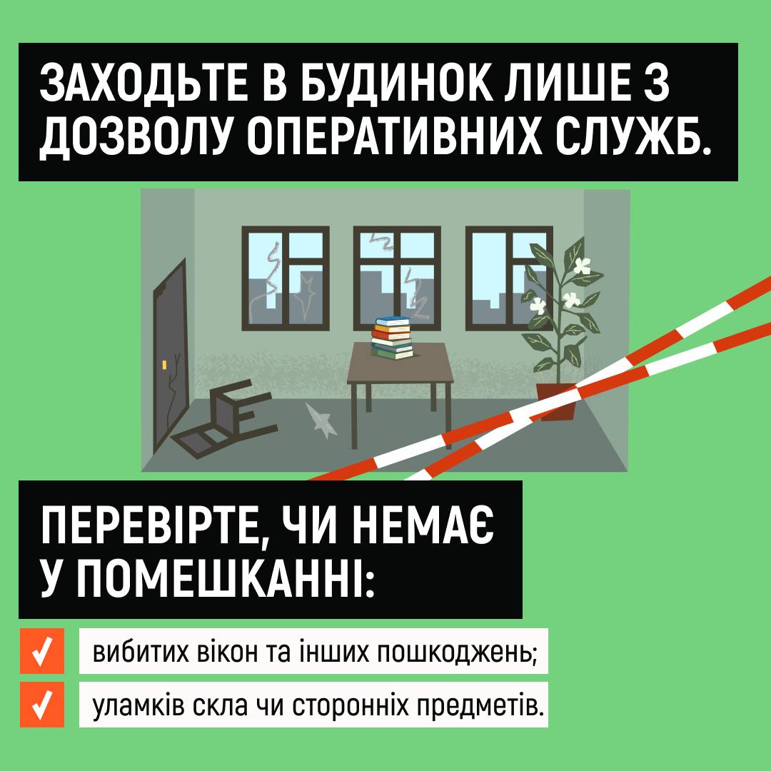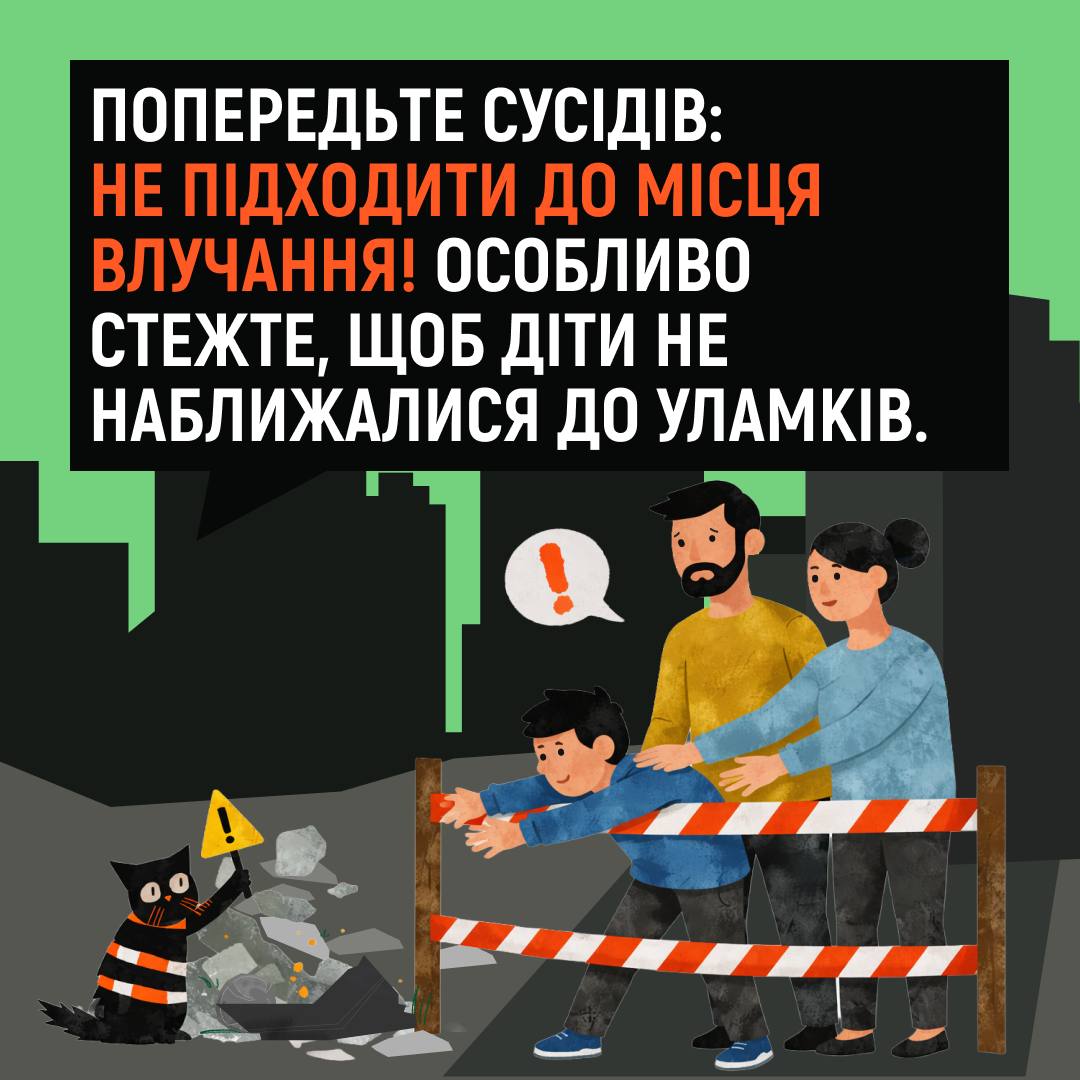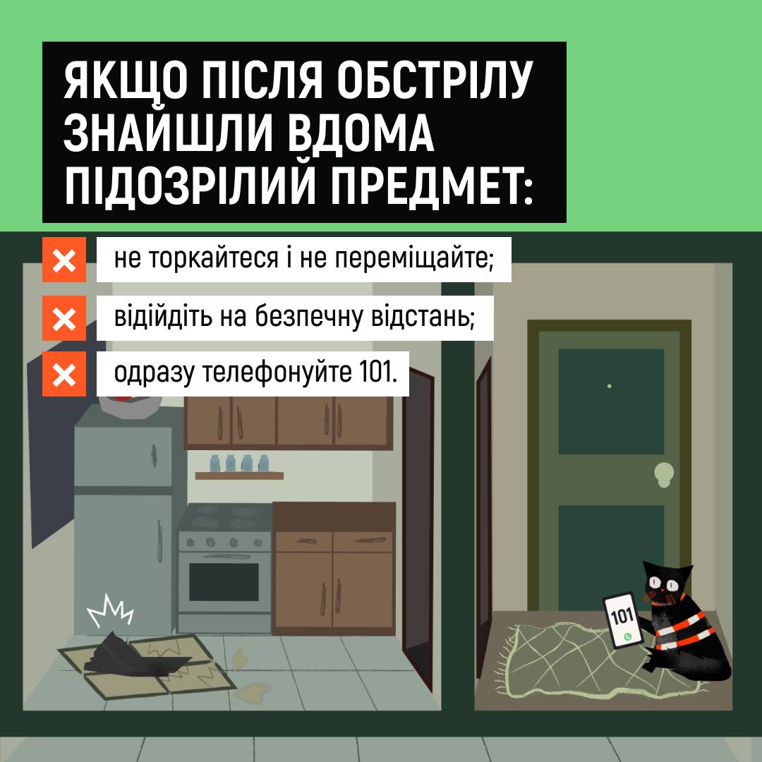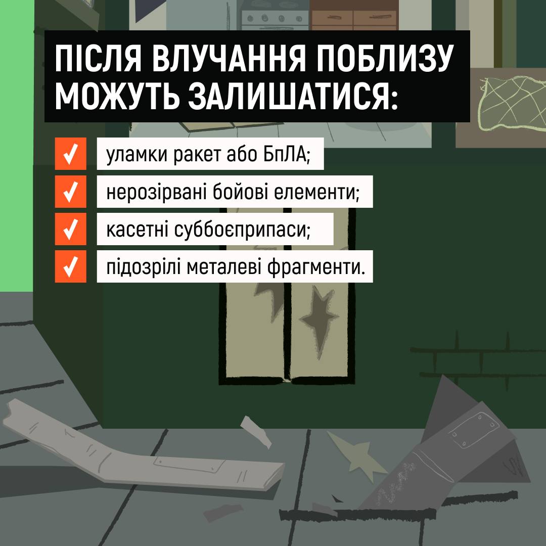 Державна служба з надзвичайних ситуацій закликала українців дотримуватися правил безпеки у разі влучання під час обстрілу поруч із житлом. Після повернення з укриття існує ризик виявлення уламків і частин вибухонебезпечних предметів.
