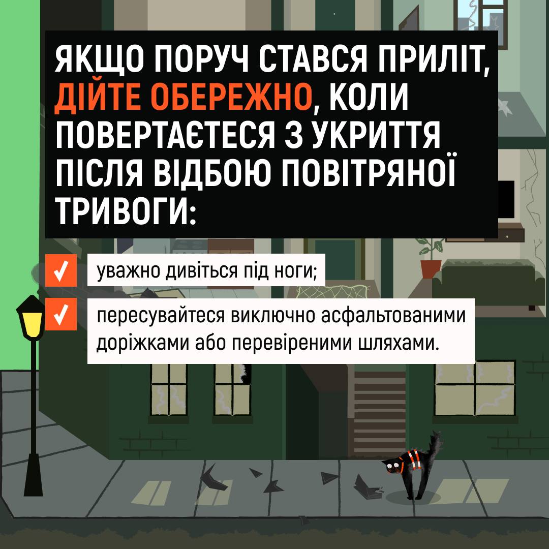 Що робити, коли під час обстрілу сталося влучання поруч із вашим будинком? Адже навколо або навіть у вашому помешканні можуть опинитися уламки та частини вибухонебезпечних предметів! – дізнатися про алгоритм дій після повернення з укриття у картках можна з підготовленої інфографіки.