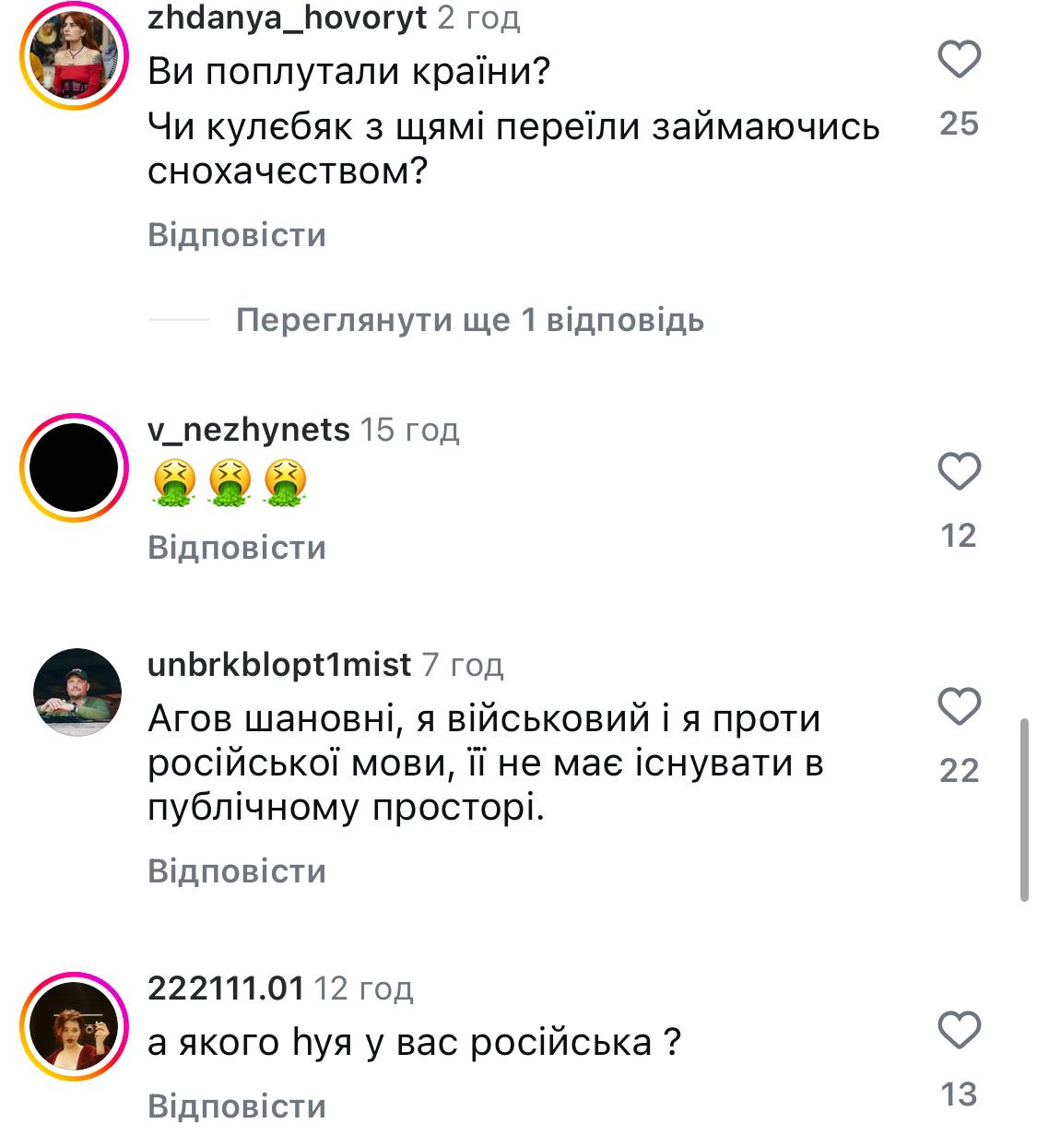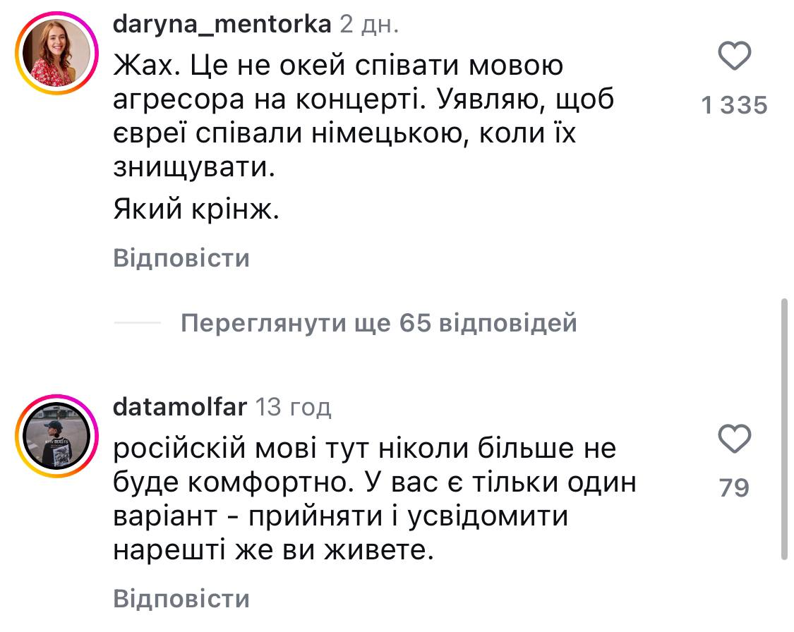 - Під час інтерв’ю ведучій Маші Єфросиніній співачка Христина Соловій заявила, що у всіх російськомовних українців, які “будували мости культурні” між Росією та Україною, “на руках, на серці і на душі завжди буде кров”.