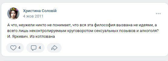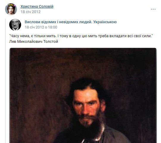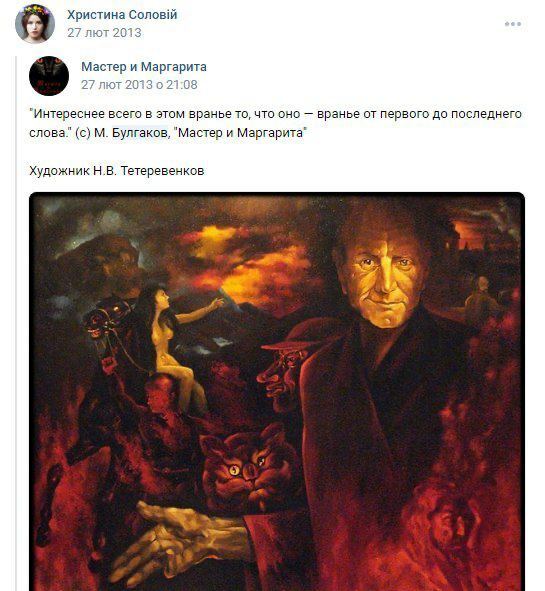 Однак, Telegram-канал “Катарсис” опублікував скріни з дописів Христини Соловій, де вона поширювала цитати російських письменників, а також була підписана на російські сторінки в соцмережі “ВКонтакте”.