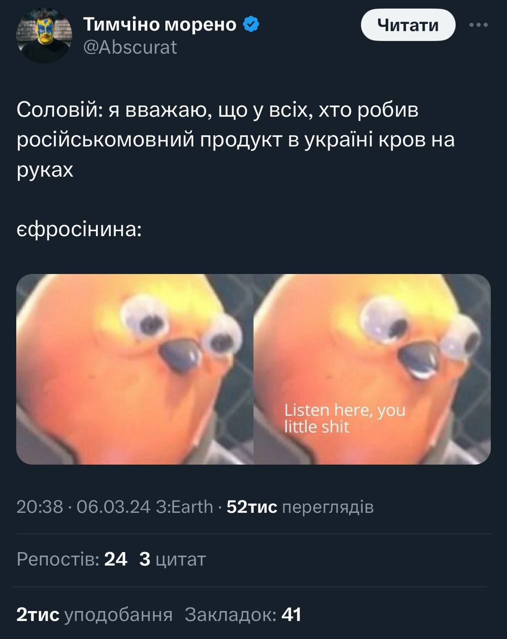 “Вже той факт, що на інтервʼю у Єфросиніної сидить не зрадниця-малороска Лобода, а українка з чіткою громадянською позицією – Христина Соловій, і те, що вона розказує не про Кіркорова і якогось Оксімірона, а про Вакарчука і Жадана, і те, що вона твердо наголошує, яку роль відіграє попкультура для України під час війни, а не блеє про “какую разніцу” – надважливо і фундаментально”.