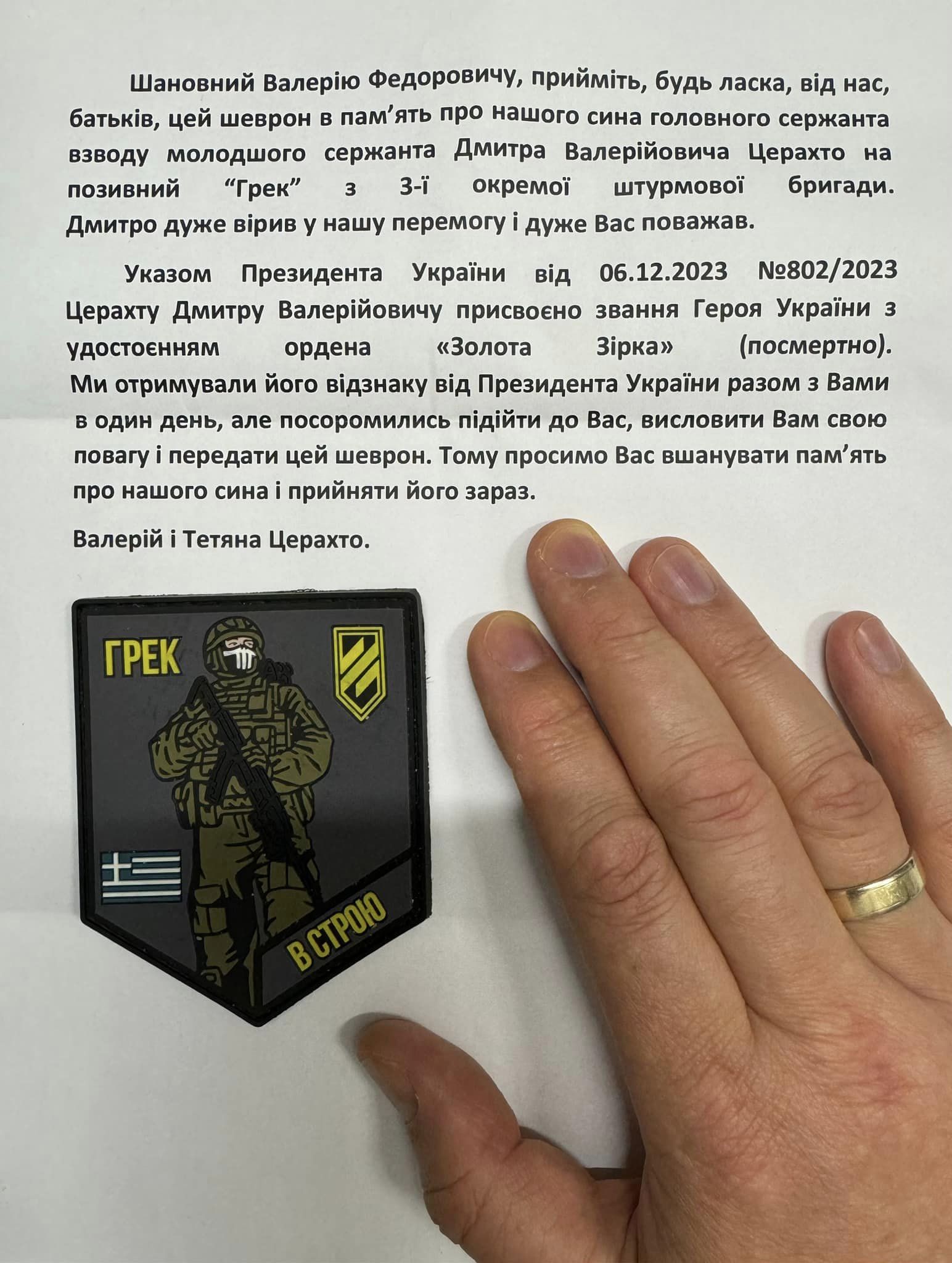 17 липня колишній Головнокомандувач ЗСУ, а нині посол України у Великій Британії, Валерій Залужний опублікував лист від батьків загиблого українського воїна Дмитра Церахто, котрі передали генералу шеврон свого сина.