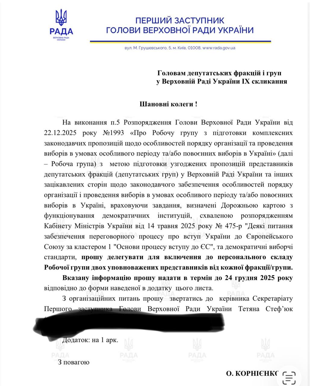 “На фракції та групи Ради (переконаний до ЦВК, та на різні ГО також) прийшло запрошення від Олександра Корнієнко надати по 2 представники в робочу групу щодо законодавчого забезпечення особливостей порядку організації і проведення виборів в умовах особливого періоду та/або повоєнних виборів в Україні”, – йдеться у повідомленні.