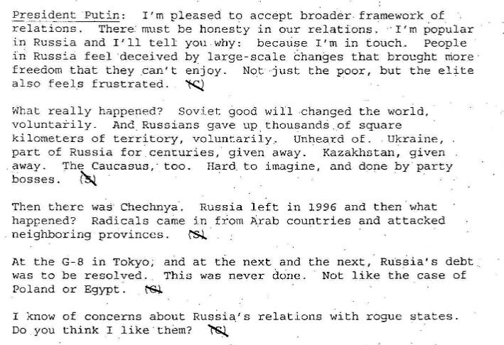 У США оприлюднили стенограми зустрічей і телефонних розмов російського диктатора Володимира Путіна з 43-м президентом США Джорджем Бушем-молодшим, що охоплюють період із червня 2001 року до квітня 2008-го.