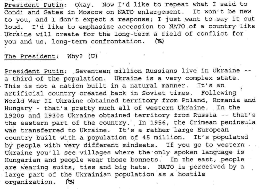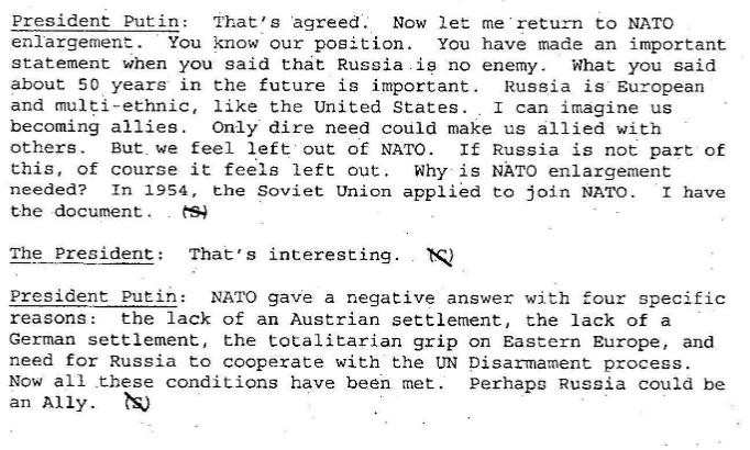 Також документи підтверджують, що на початку 2000-х Путін активно порушував питання приєднання Росії до НАТО, апелюючи до заявки СРСР 1954 року і стверджуючи, що Росія виконала всі умови для членства.