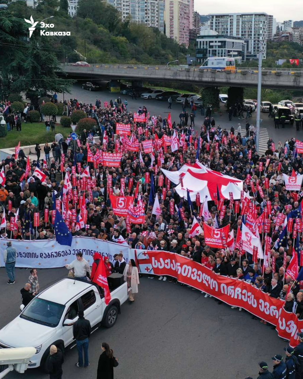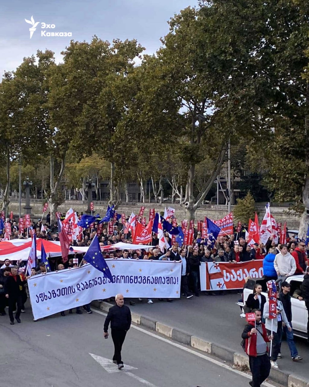 Прихильники європейського курсу країни зібрлися на п’яти локаціях: на площі Республіки, площі Героїв, біля станцій метро “Марджанішвілі” та “300 арагвінців”, біля перетину вулиць Амаглеба та Асатіані в районі Мтацмінда. Вони рушають маршем до площі Свободи, де о 18:00 за Києвом запланований великий мітинг.