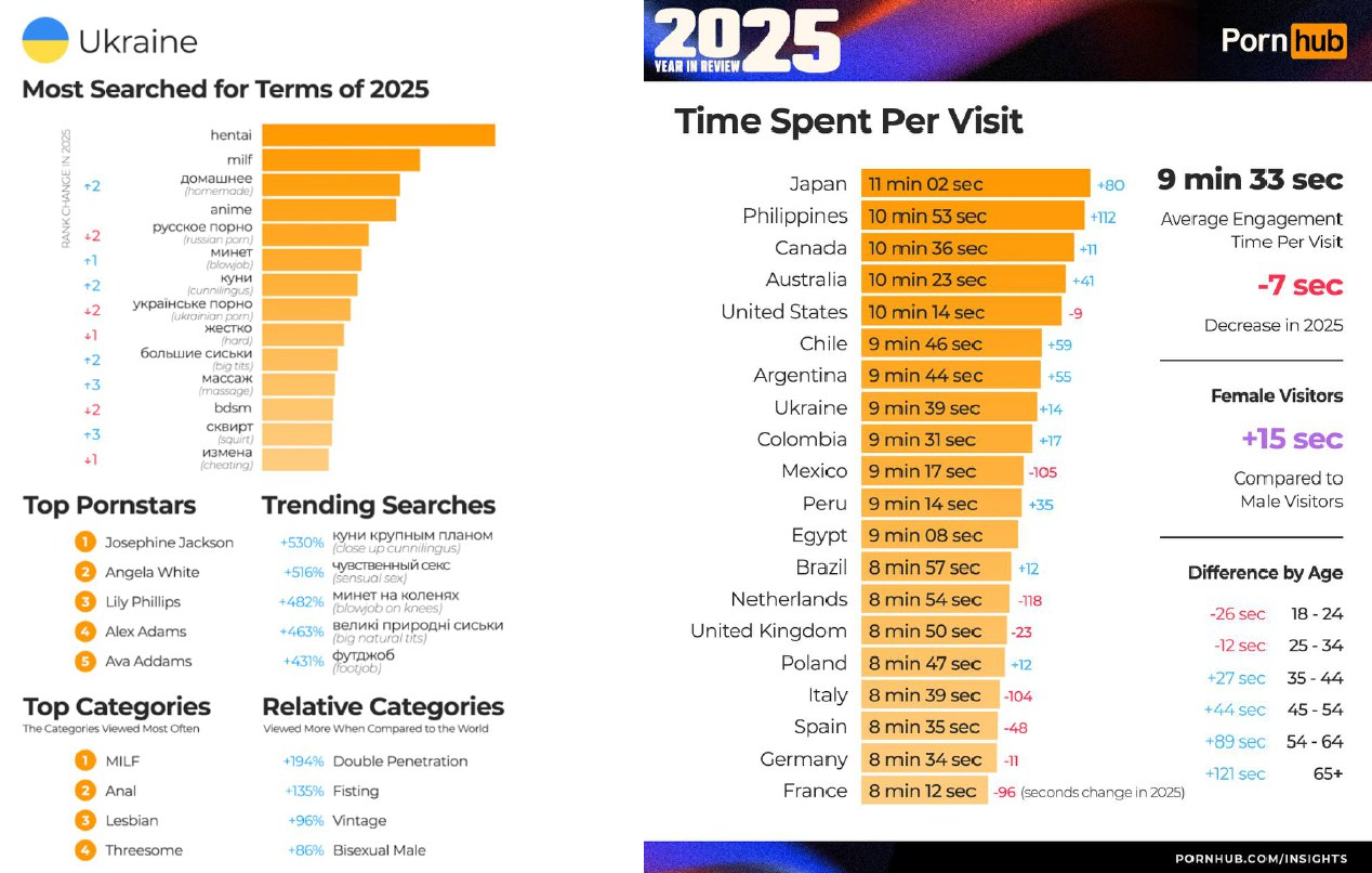 Порнографічний ресурс PornHub опублікував свій річний звіт за 2025 рік який демонструє, що Україна посіла 16-те місце у глобальному рейтингу за загальним обсягом трафіку. Водночас за середньою тривалістю перегляду українські користувачі увійшли до топ-8 країн світу.