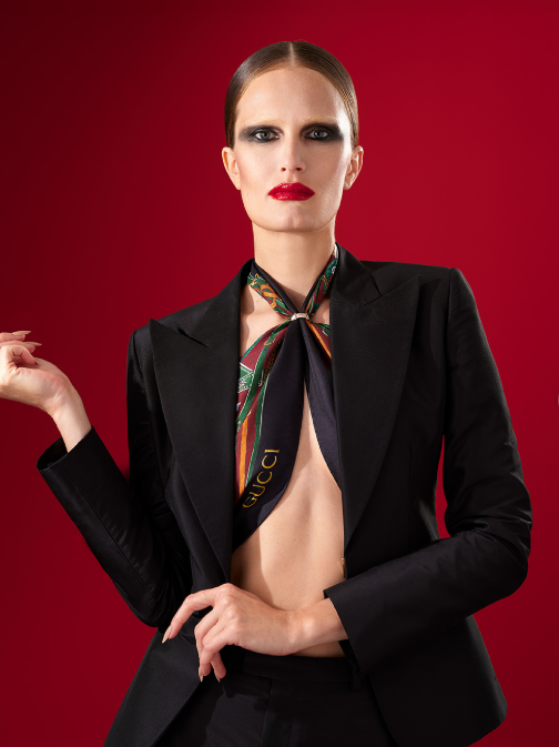 Українська модель Алла Костромічова знялась для GUCCI, демонструючи один з шарфів бренду.