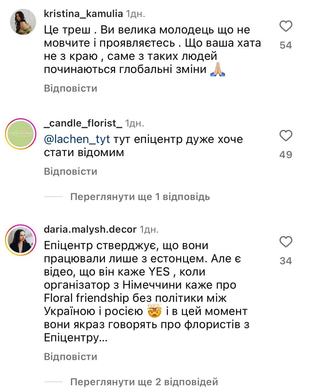 Представниця Департаменту зі зв’язків з громадськістю компанії “Епіцентр” Олена Коваленко прокоментувала ситуацію та зазначила, що погоджується, що “організатори вели себе некоректно та неприпустимо, заявляючи про флористичну дружбу між Україною та РФ”.