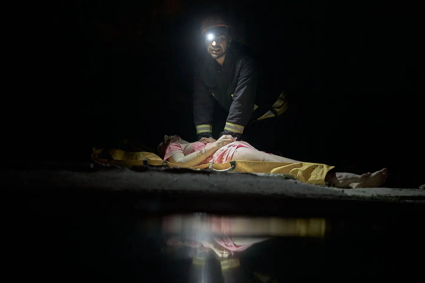 Костянтин Ліберов. Фотографія від 28 серпня, який зображує рятувальника, який допомагає жертві у Києві. Це сталося біля житлового будинку, пошкодженого російською ракетою.