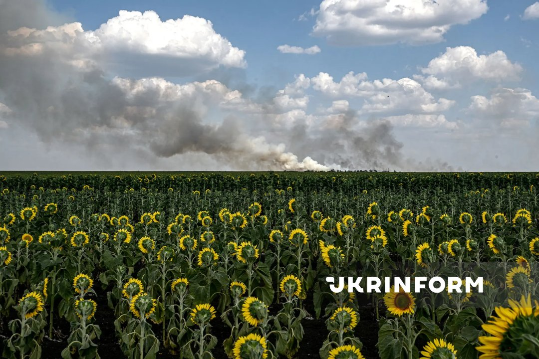 Дмитро Смольєнко (Укрінформ). Знімок зроблено 8 липня на Запоріжжі. Він фіксує дим від російського обстрілу над полем соняшників.