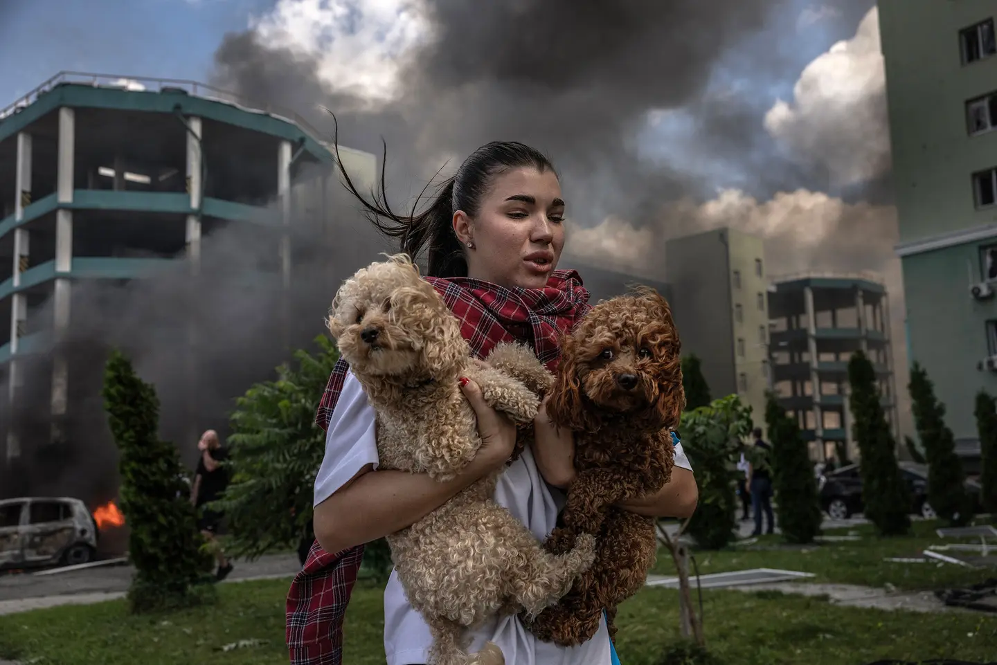 Девід Ґаттенфельдер (David Guttenfelder). Фото 24 липня демонструє жінку з домашніми тваринами. Вона тікає з дому на Харківщині після російських бомбардувань.
