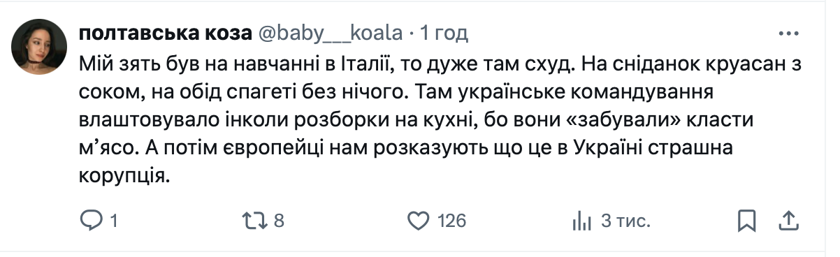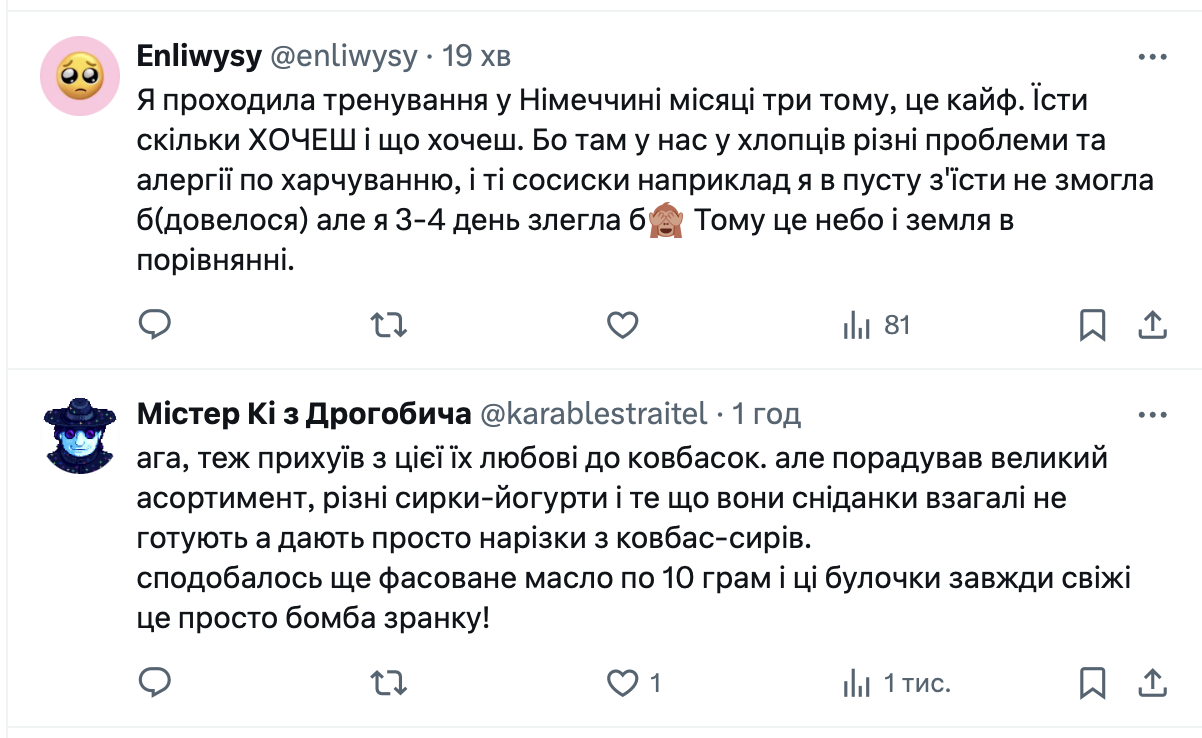 Люди скаржаться, що після навчань військові худнуть через погане харчування та невелику кількість їжі. Однак є й ті, хто розповідає про свій позитивний досвід щодо харчування в іноземних військових базах.