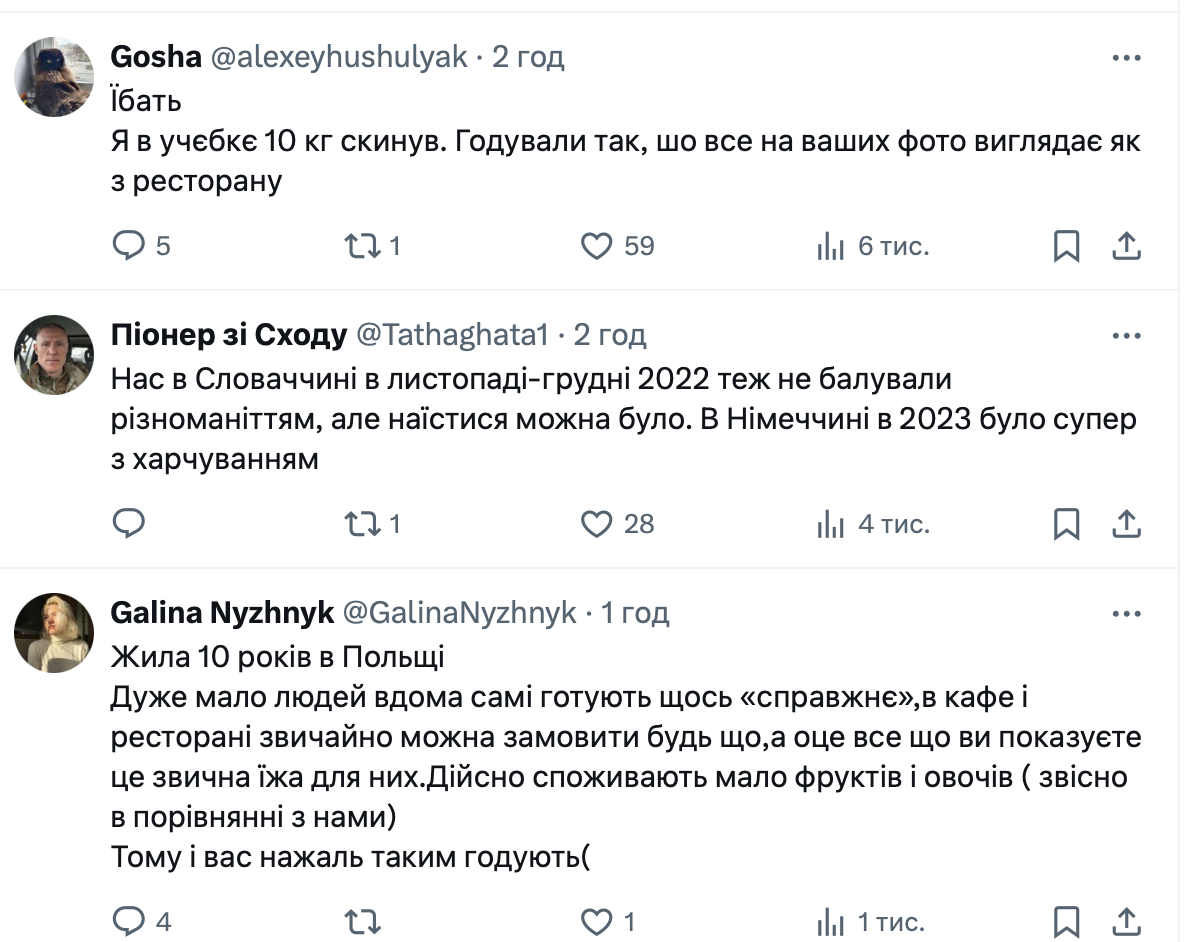 Інші користувачі розповіли також про погане харчування під час навчань в Грузії, Словаччині та Італії.