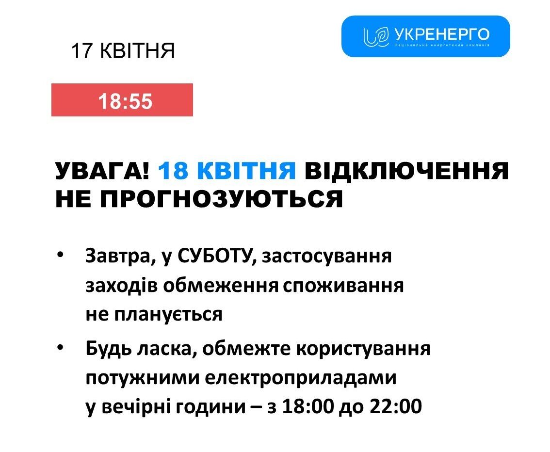 18 квітня в Україні відключення електроенергії для побутових споживачів та обмеження потужності для промисловості не плануються.