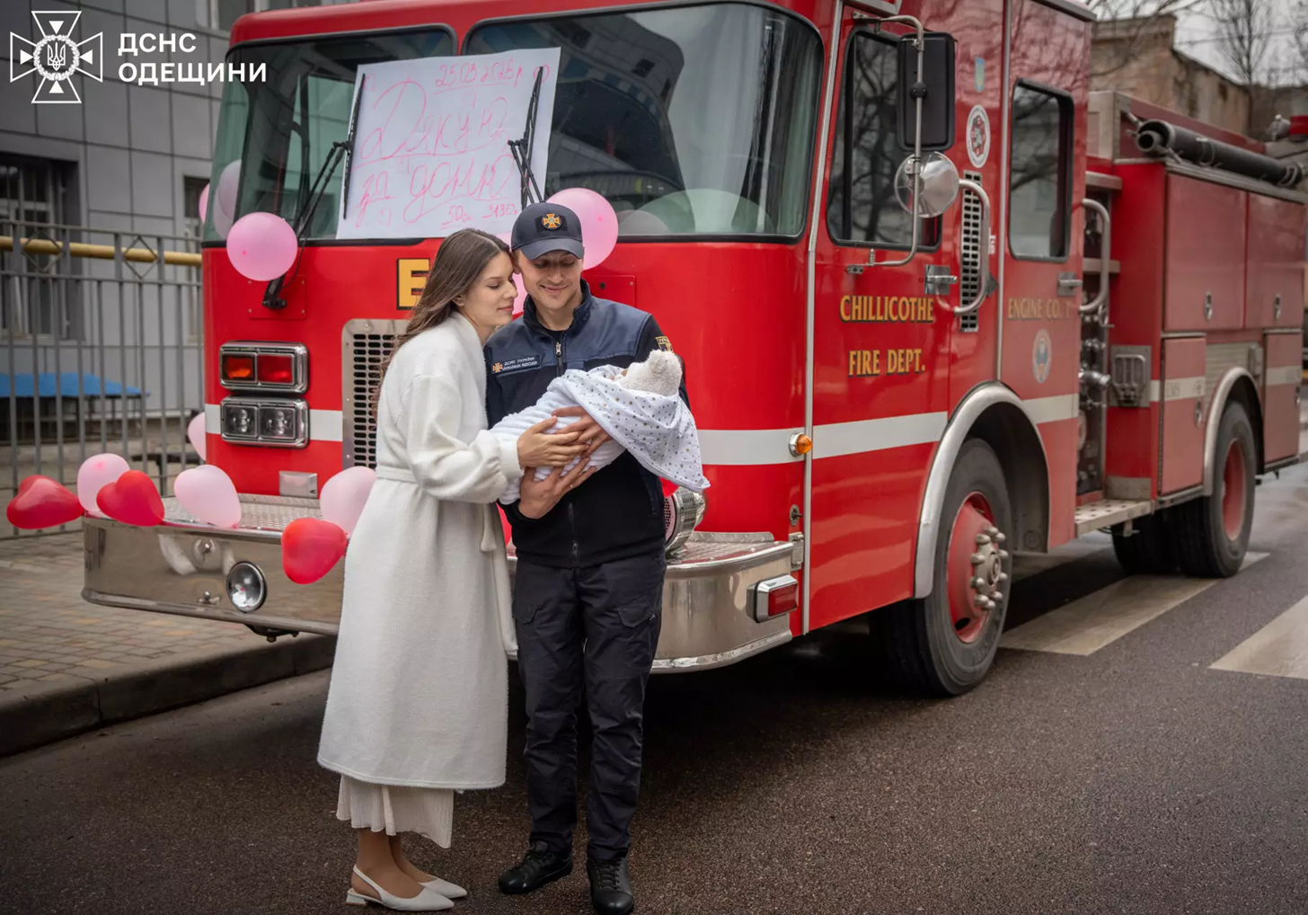 В Одесі рятувальники зустріли новонароджену доньку свого колеги на пожежній машині.