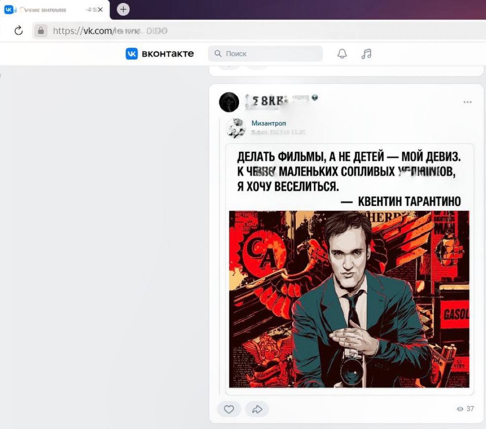 Як докази наводяться три зображення: колаж з персонажами різних фільмів і серіалів, що демонструють середній палець, скріншот з анімаційного серіалу “Рік і Морті”, а також фотографія режисера Квентіна Тарантіно з цитатою про те, що його життєвий девіз — “робити фільми, а не дітей”. Як перші два зображення пов’язані з “пропагандою чайлдфрі”, у поліції не пояснили.