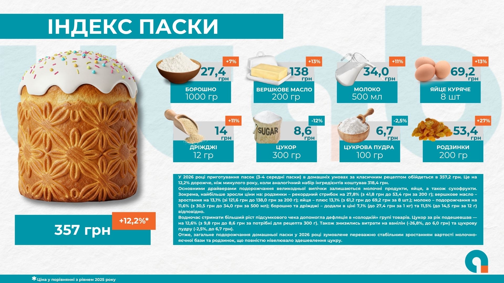 Своєю чергою, зростання вартості яєчно-молочної бази вплинуло на цьогорічний “індекс паски”. Приготування 3-4 середніх пасок за класичним рецептом обійдеться у 357,2 грн (+12,2%).