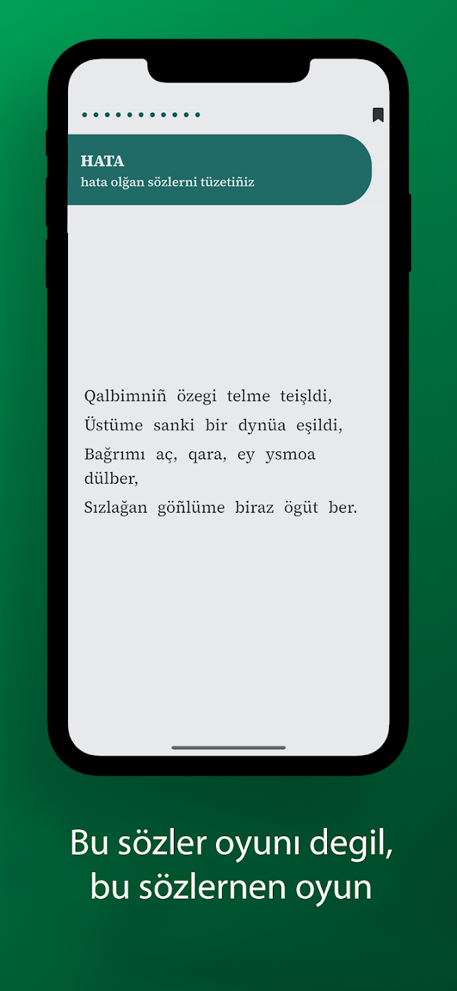 Lağoda QT – це головоломка, де кожен рівень – це вірш одного з видатних кримськотатарських авторів, у якому треба знайти помилку.