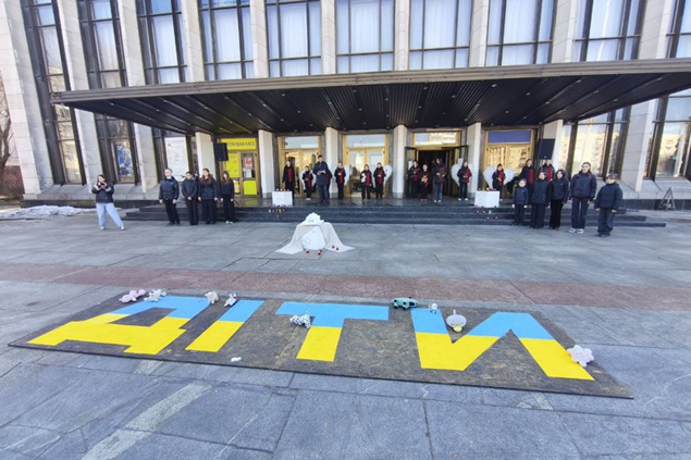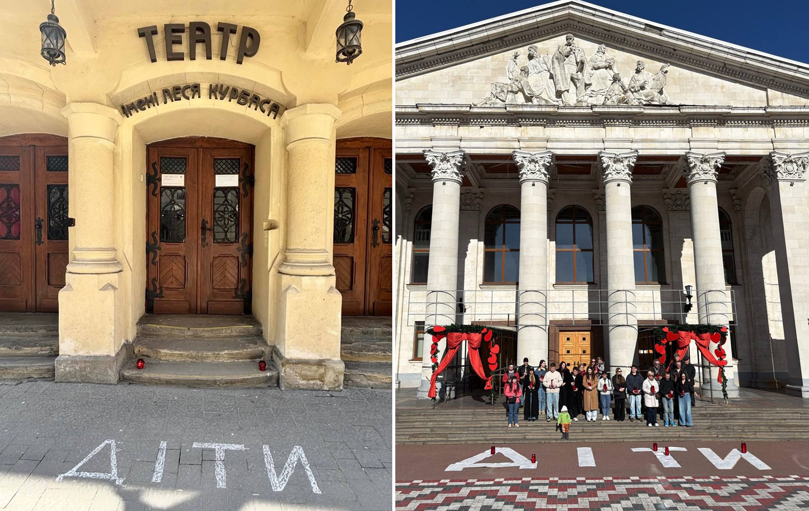 У багатьох містах перед театрами та на площах відтворювали напис “ДЕТИ” – символічне нагадування про великий напис, який у день трагедії був зроблений перед будівлею маріупольського театру, щоб показати, що всередині перебувають цивільні.