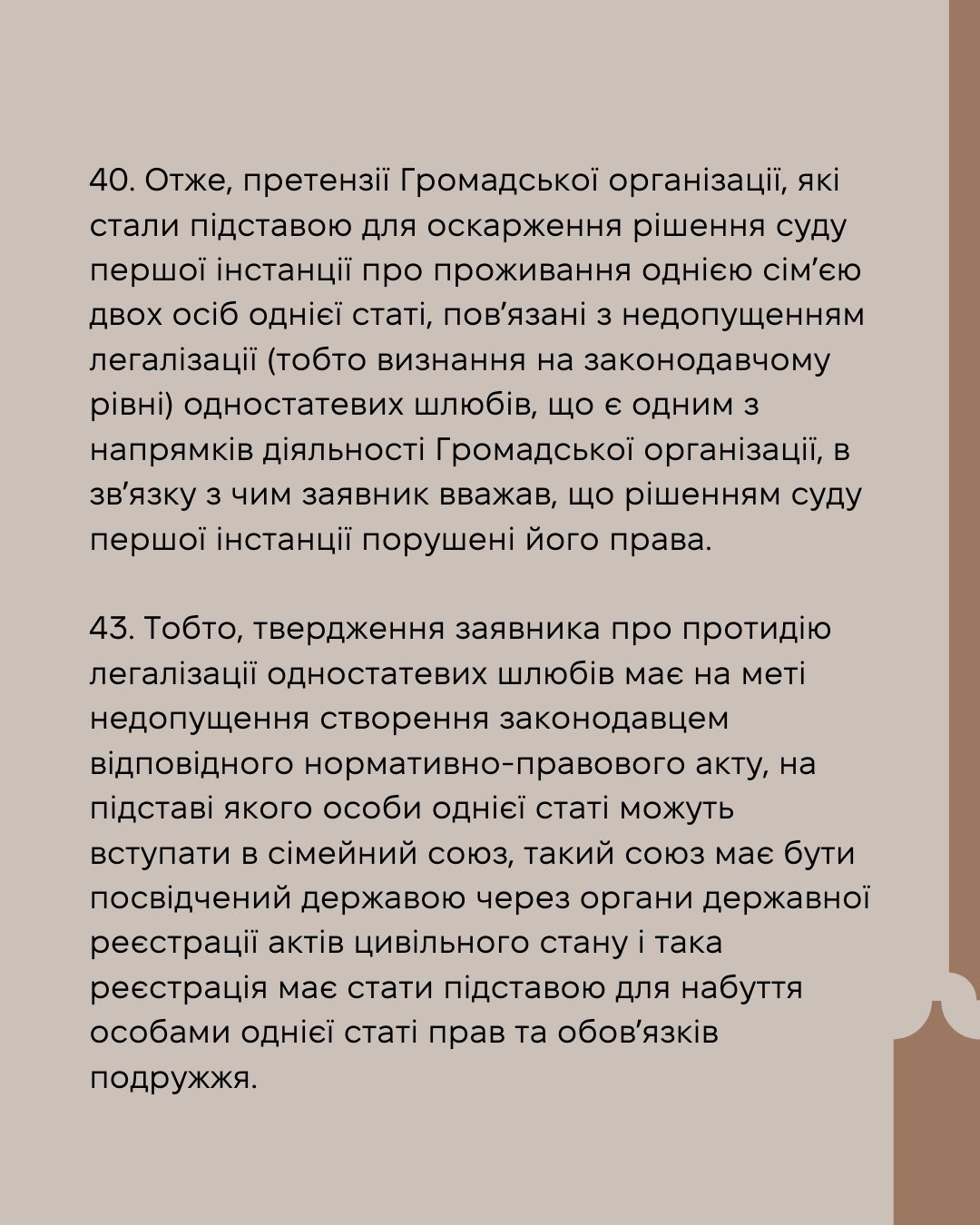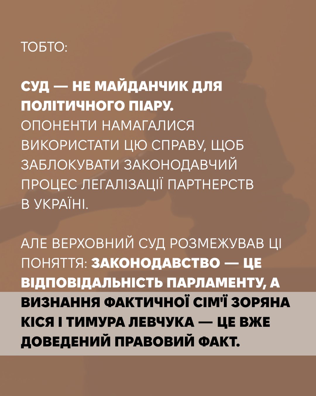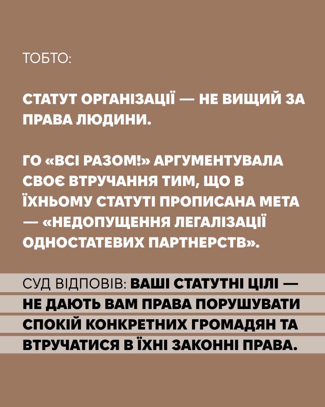 Це колосальний прецедент. Жодна гомофобна чи консервативна організація не зможе використовувати суди як інструмент для переслідування чи скасування рішень на користь ЛГБТІ+ людей, прикриваючись “суспільною мораллю”. Держава захистила межі приватного життя, – наголосили у ГО.