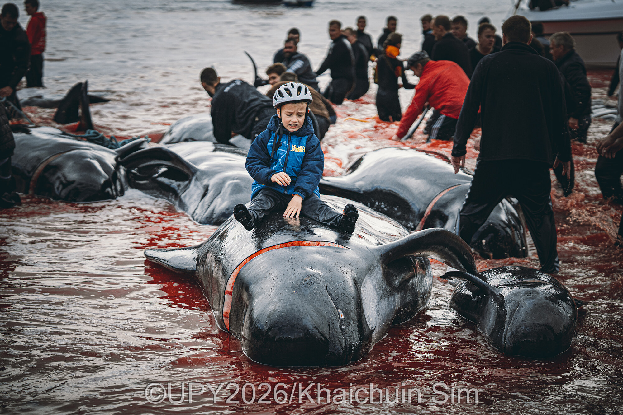 У категорії, присвяченій збереженню морської природи, переміг Хайчуїн Сім із Малайзії. Він зафіксував на Фарерських островах традиційне полювання на гринд – представників родини дельфінових. На знімку маленький хлопчик сидить на вбитій тварині серед води, що забарвилася в червоний колір. Місцева громада вважає цю практику частиною культурної спадщини та джерелом харчів, однак у світі її часто критикують через жорстокість і шкоду для морської фауни.